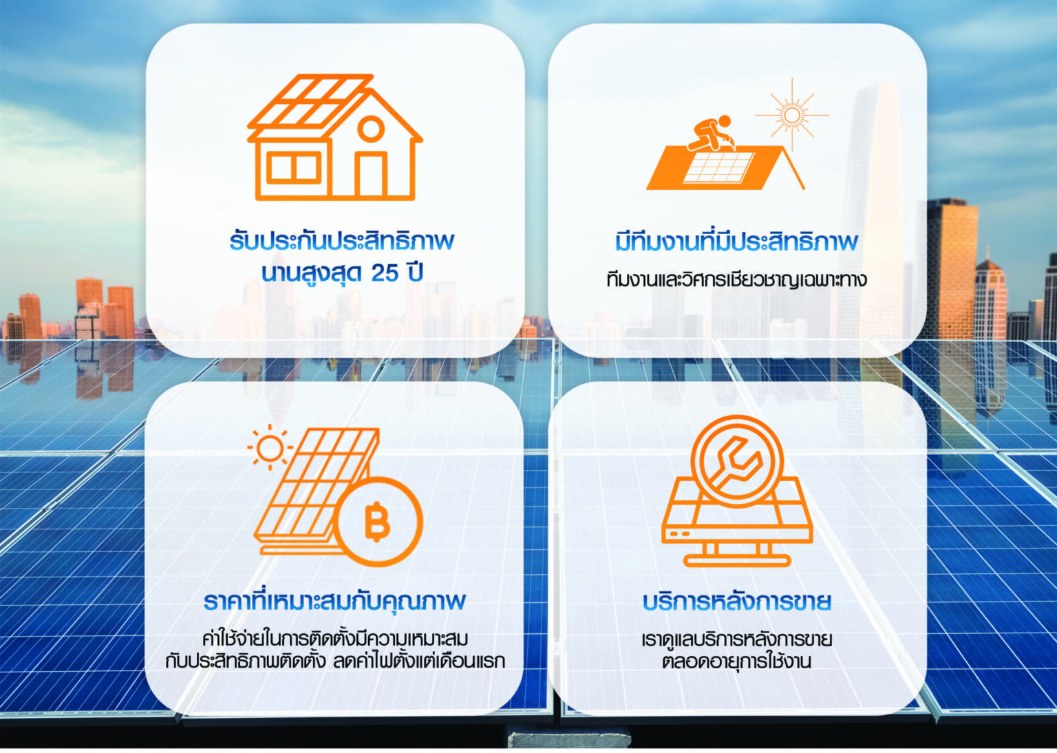 ลงทุนครั้งเดียว ระบบโซลาร์จะผลิตไฟฟ้าให้คุณได้ใช้ฟรี ยาวนานถึง 25 ปี ช่วยให้คุณประหยัดค่าไฟฟ้า ลดต้นทุนทางธุรกิจ ด้วยการเติบโตอย่างมั่นคง คุณจึงมั่นใจได้ว่า เราจะอยู่ดูแลคุณไปตลอดอายุการใช้งาน